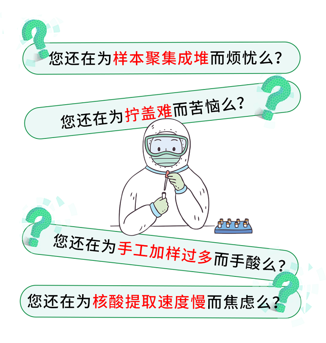 全程自动化完成原始管的信息录入,开关盖,移液和核酸提取,实现样本进,核酸出的自动化过程。